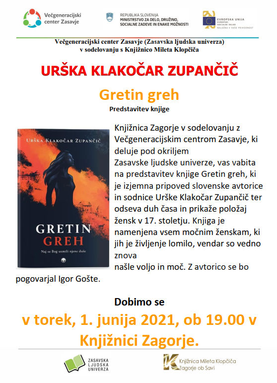 Večgeneracijski center Zasavje in Knjižnica Mileta Klopčiča Zagorje ob Savi vas vabita na predstavitev knjige Gretin greh.