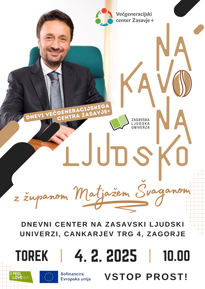 Na kavo na Ljudsko! je prijetno dopoldansko druženje, ki poteka vsak torek v dopoldanskih urah v Dnevnem centru VGC+ na Zasavski ljudski univerzi, Cankarjev trg 4, Zagorje ob Savi. Dogodek je namenjen vsem, ki si zjutraj radi privoščijo kavo (ali čaj, vodo, sok), a jo tokrat ne bodo skuhali doma ali šli v kavarno, temveč se bodo družili v sproščenem in prijetnem okolju dnevnega centra. S seboj lahko pripeljejo prijatelje ali znance, pogovorijo pa se lahko tudi z zaposlenimi iz VGC Zasavje+ o različnih temah in vprašanjih. Dogodek je namenjen neobremenjenemu druženju in ustvarjanju prijetnega vzdušja.