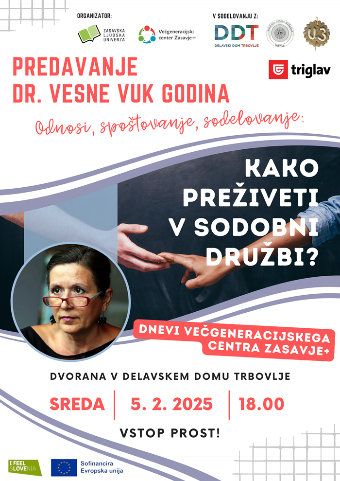 - Predavanje dr. Vesne Vuk Godina: Odnosi, spoštovanje, sodelovanje: Kako preživeti v sodobni družbi? – Kinodvorana DDT, Trbovlje (5. 2. 2025 ob 18:00)