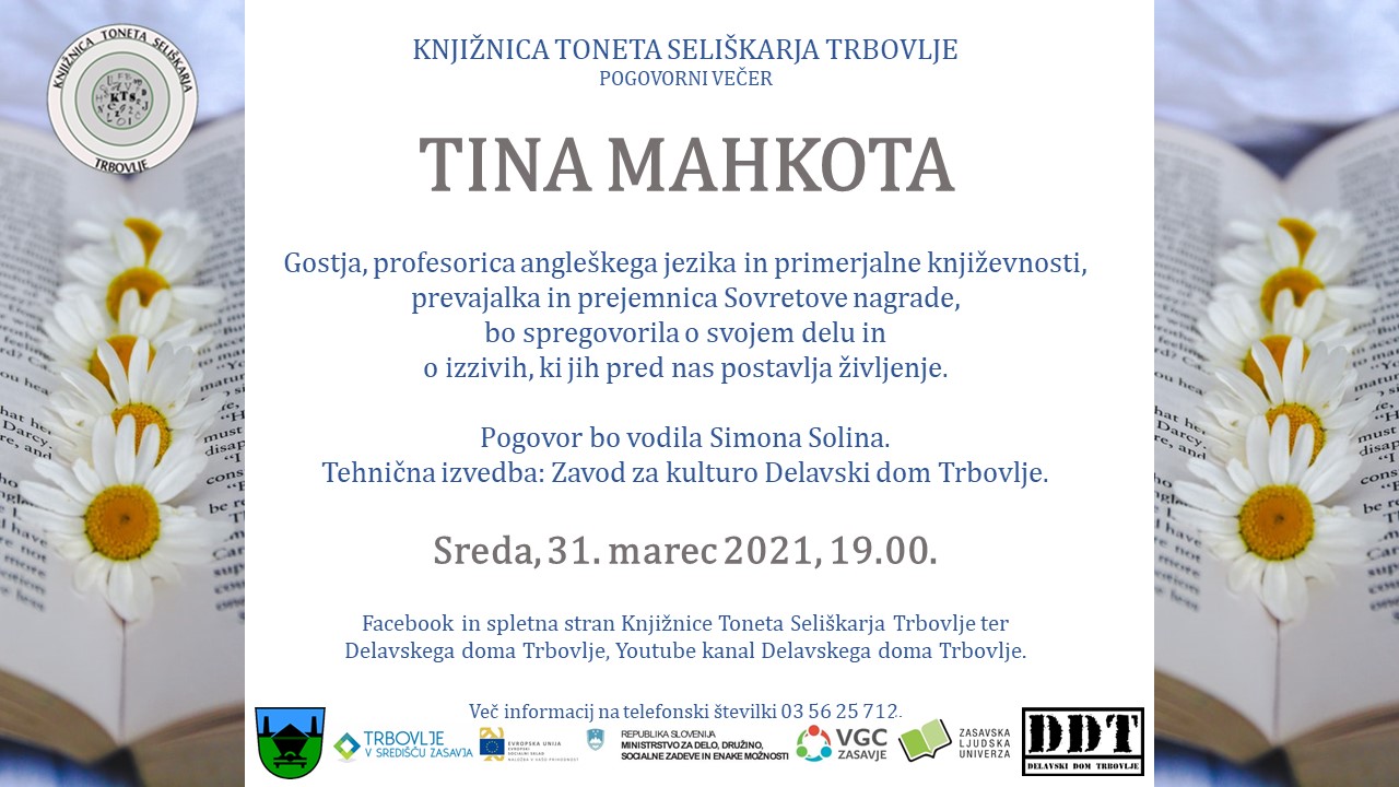 Vljudno vabljeni na pogovorni večer s Tino Mahkota, ki bo v sredo, 31. 3. 2021, ob 19.00.
