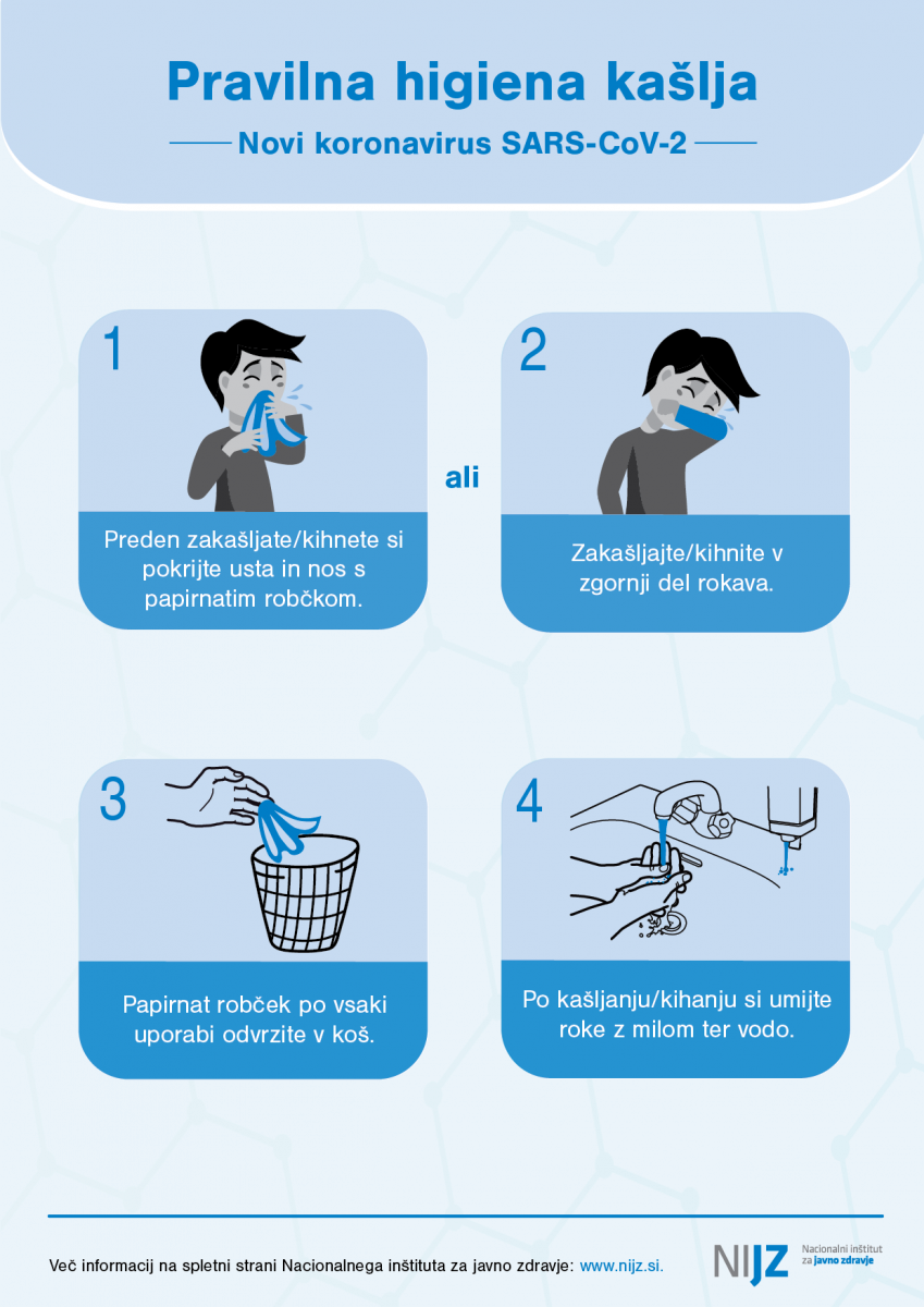 - Preden zakašljamo ali kihnemo, si pokrijemo usta in nos z robčkom ali zakašljamo in kihnemo v zgornji del rokava in ne v svojo dlan.