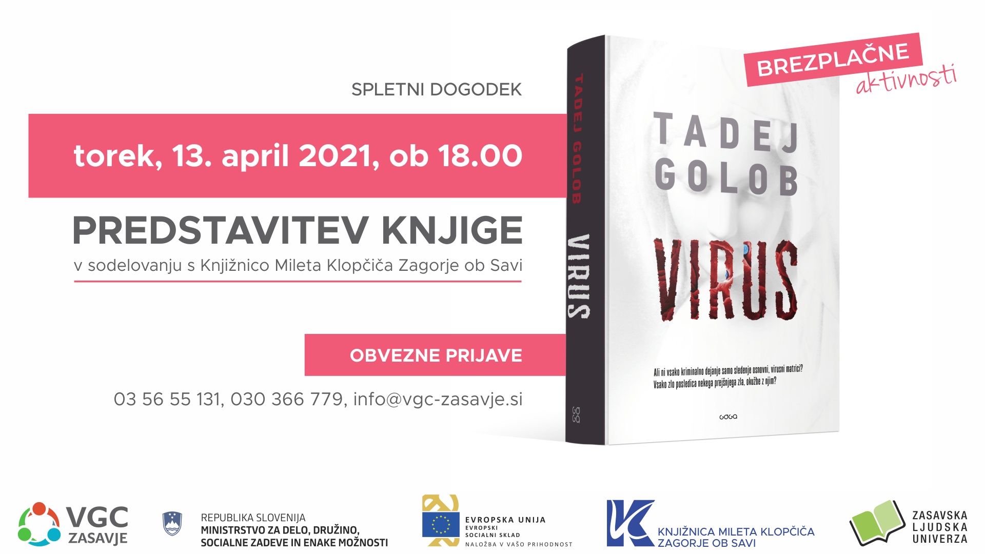 v sodelovanju s Knjižnico Mileta Klopčiča Zagorje ob Savi vabi na predstavitev knjige VIRUS, avtorja Tadeja Goloba. Dogodek bo povezoval Igor Gošte.
