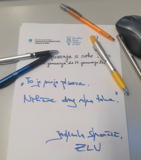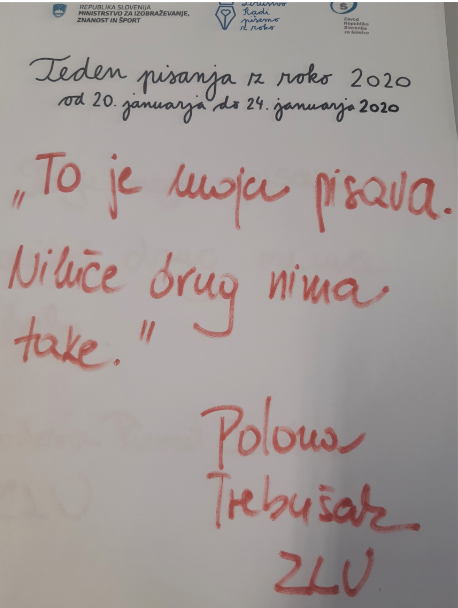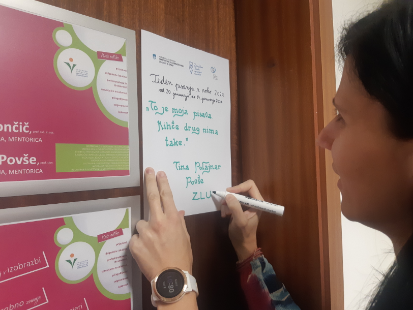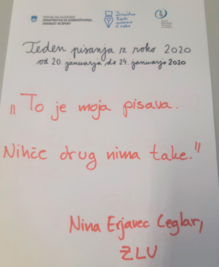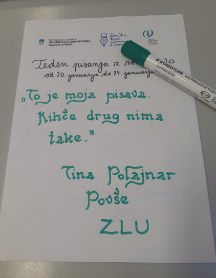 Zasavska ljudska univerza in VGC Zasavje se v tednu od 20. 1. do 24. 1. 2020 pridružujeta akciji Teden pisanja z roko 2020. Pisanje z roko je izvirna človekova aktivnost in pomembna spretnost. Spretnosti razvijamo z vajo. Raziskave kažejo, da naši možgani bolje delujejo pri pisanju z roko kot pri pisanju z računalnikom. Informacija, ki jo napišemo z roko, se v spominu zadrži dlje časa.